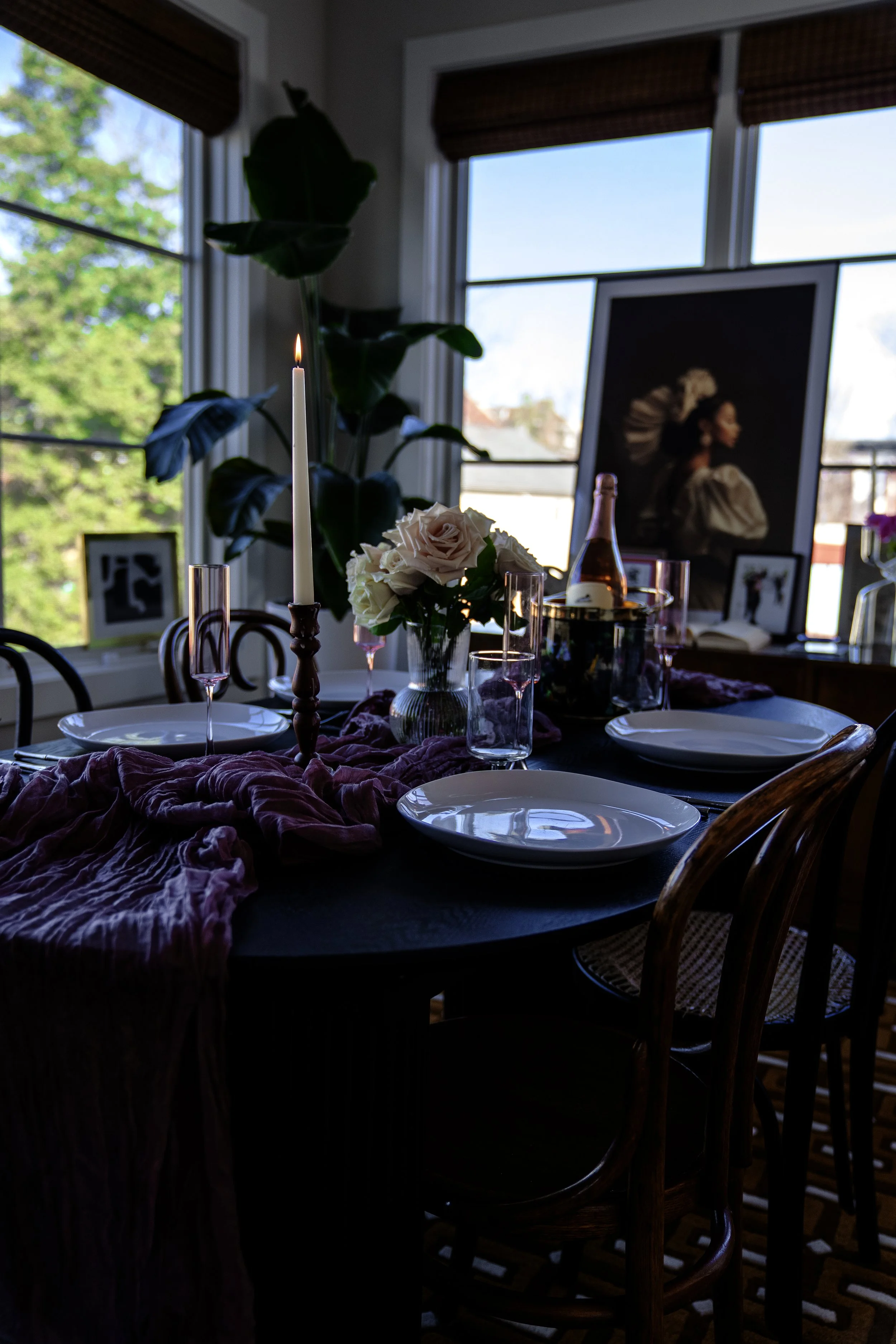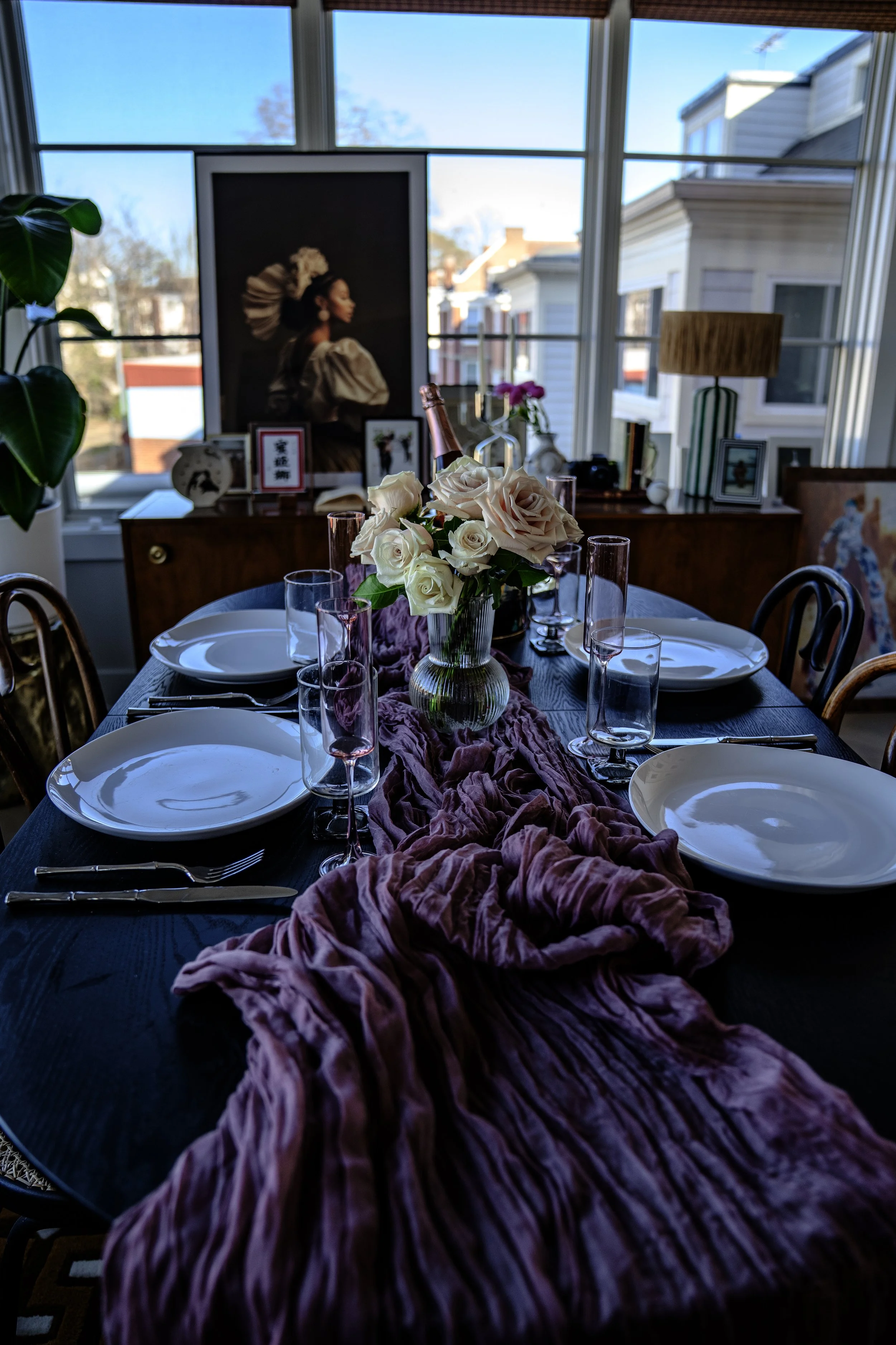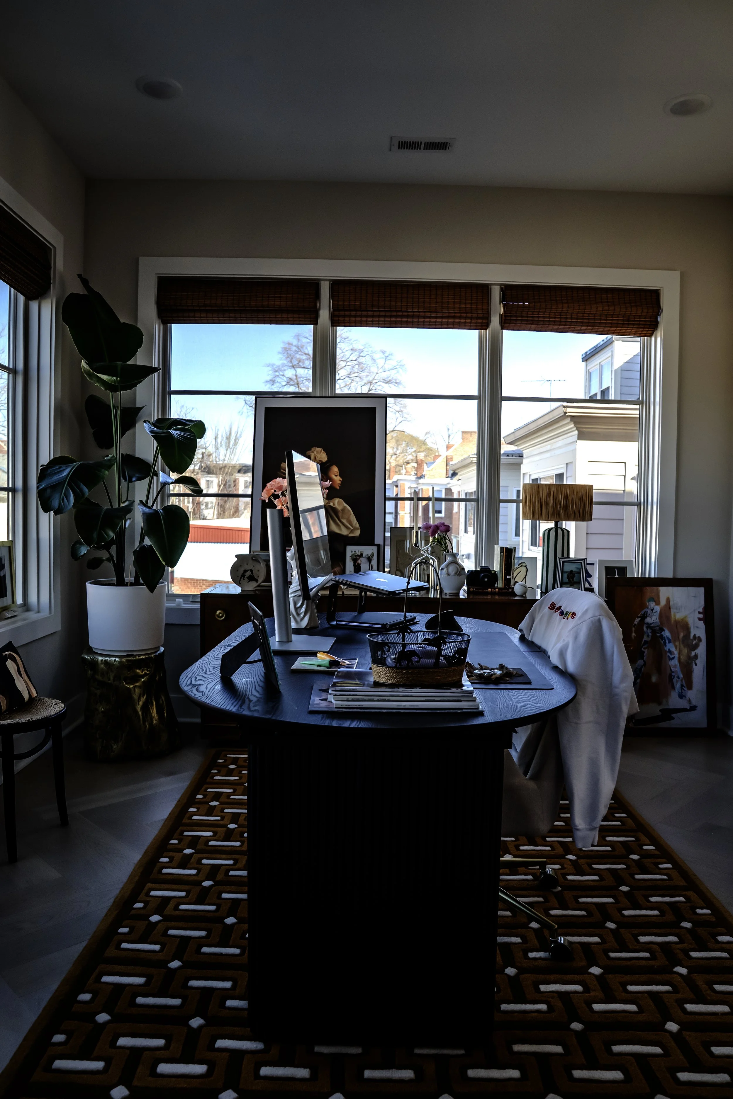 This is a hard working space. It serves as my work from home office, my dining and entertaining space, and a guest room. A few multifunctional furniture pieces make it all happen. Shop some of these pieces here and see the room in its various stages through video.