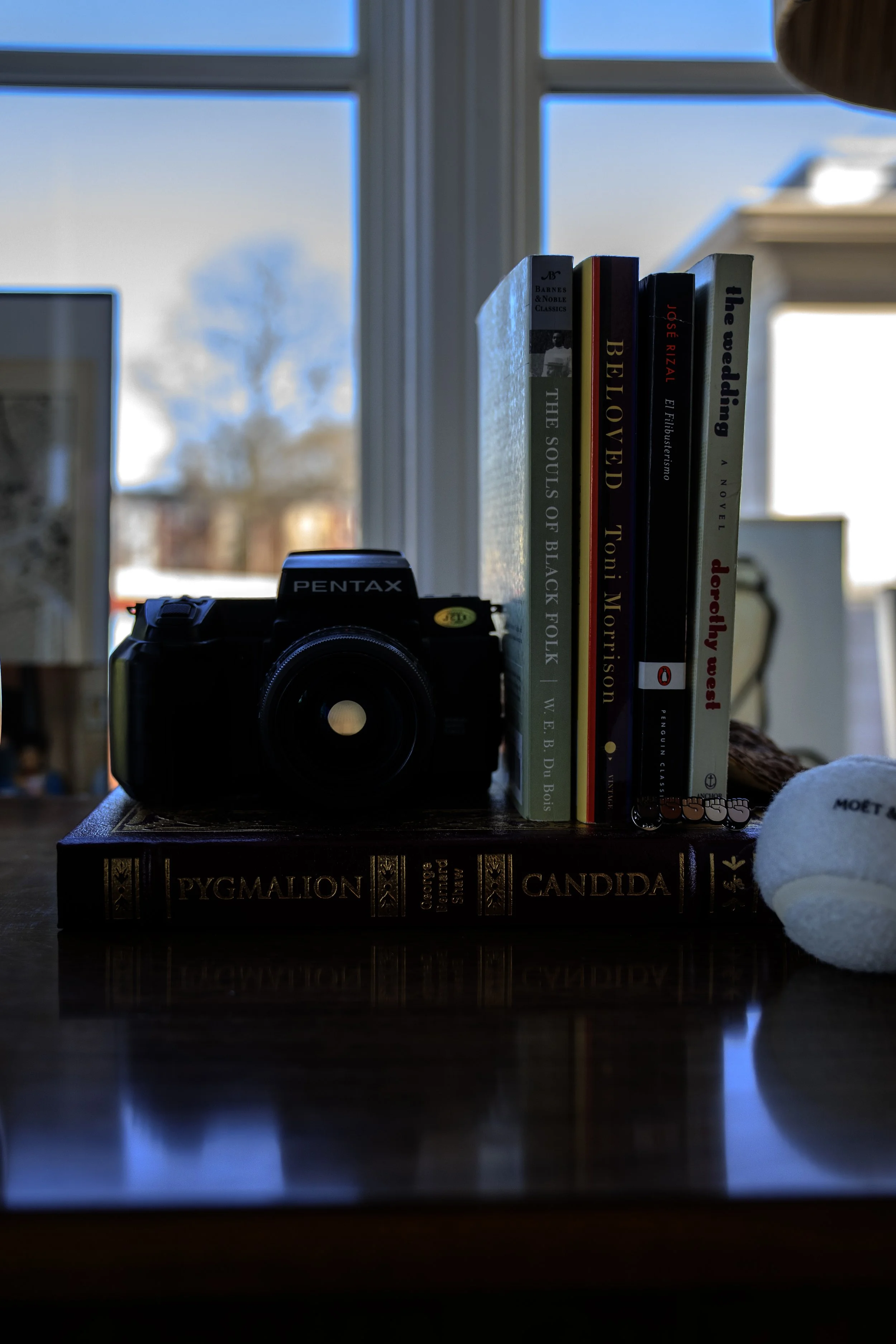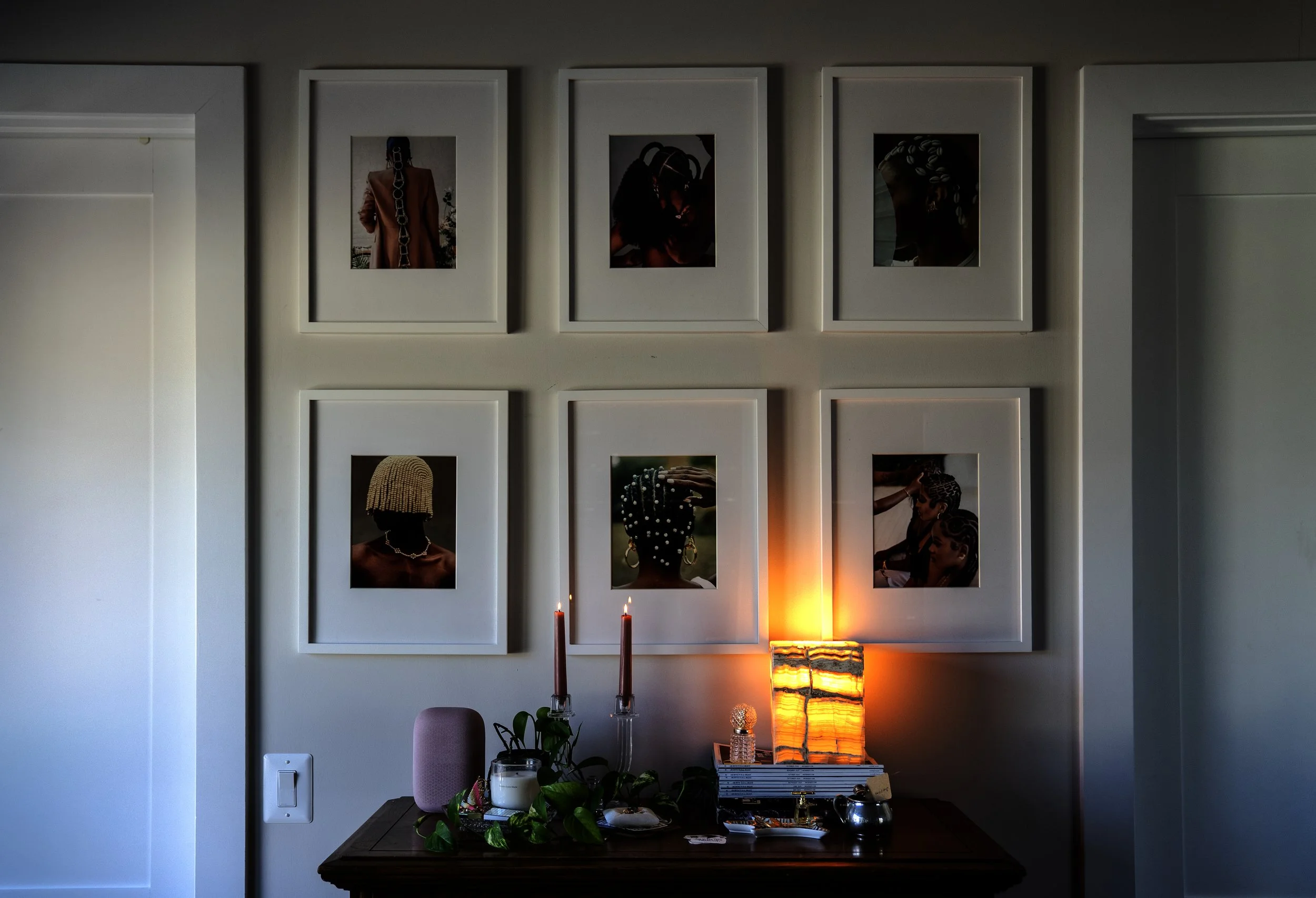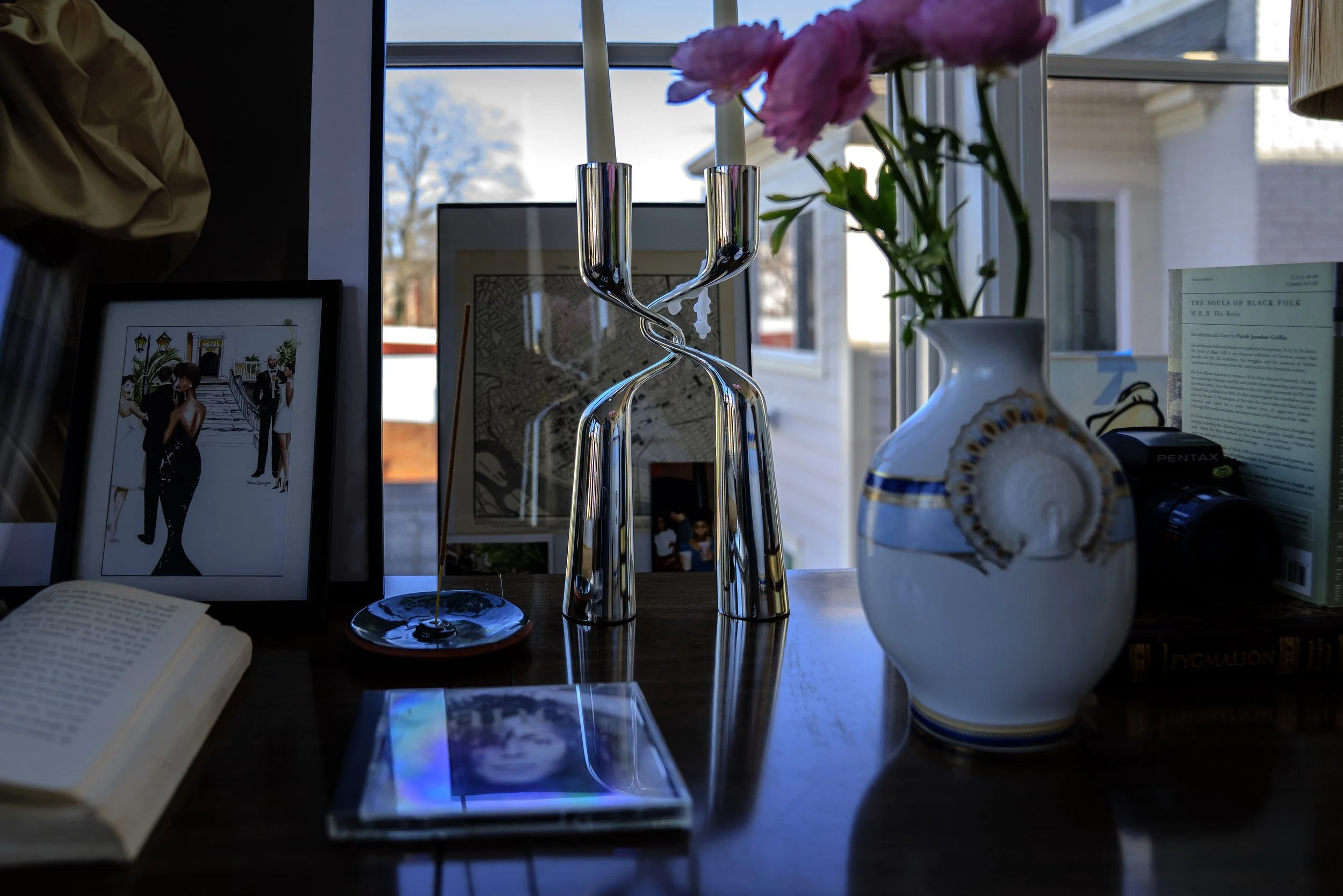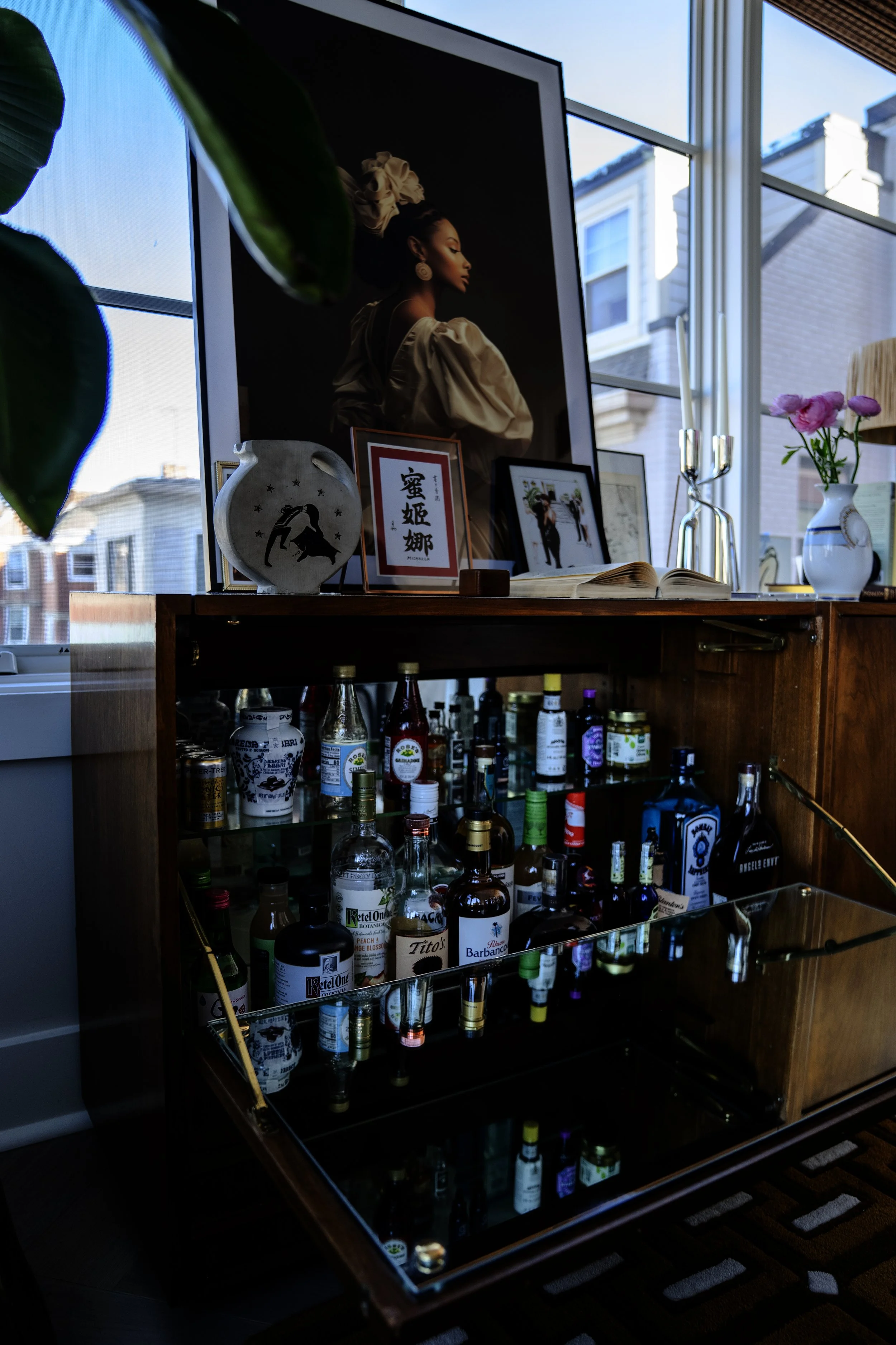 This is a hard working space. It serves as my work from home office, my dining and entertaining space, and a guest room. A few multifunctional furniture pieces make it all happen. Shop some of these pieces here and see the room in its various stages through video.